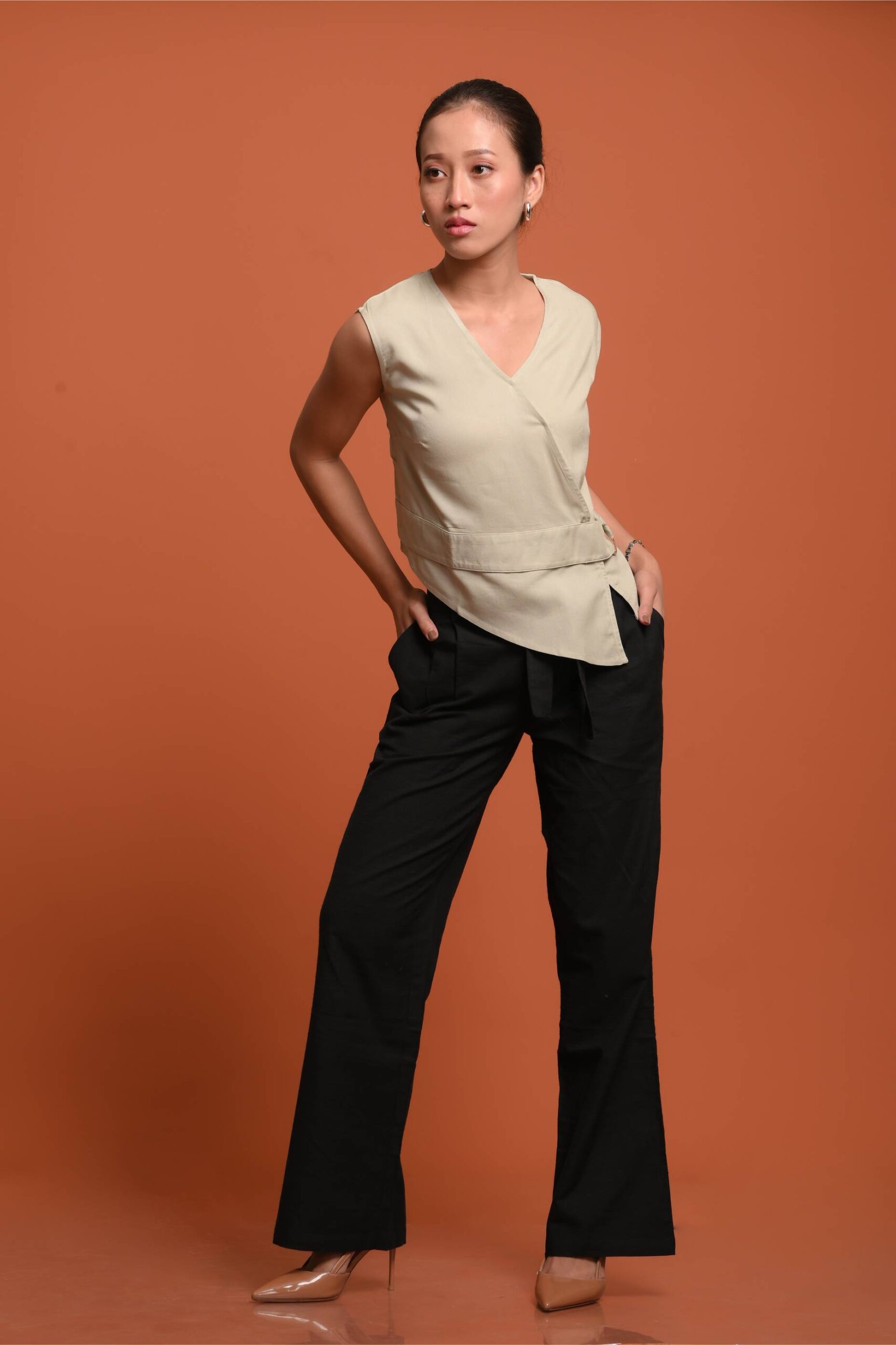 Crafted in fluid viscose, this top balances clean structure with sculptural detailing. It features extended shoulders and a soft, high neckline, finished with a metal buckle at the side seam that anchors a wrap-style belt panel, adding a refined, layered look without complicating the fit.