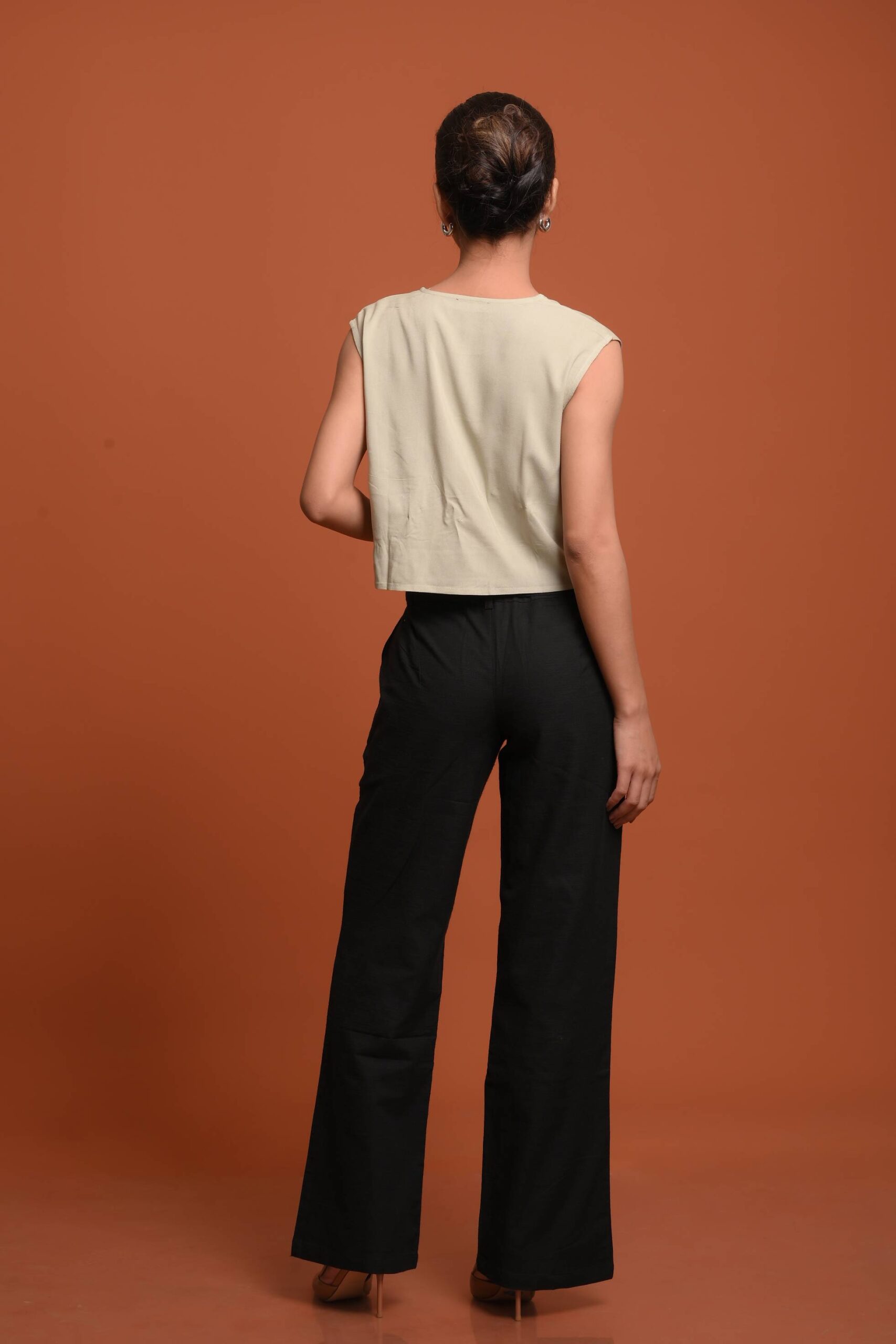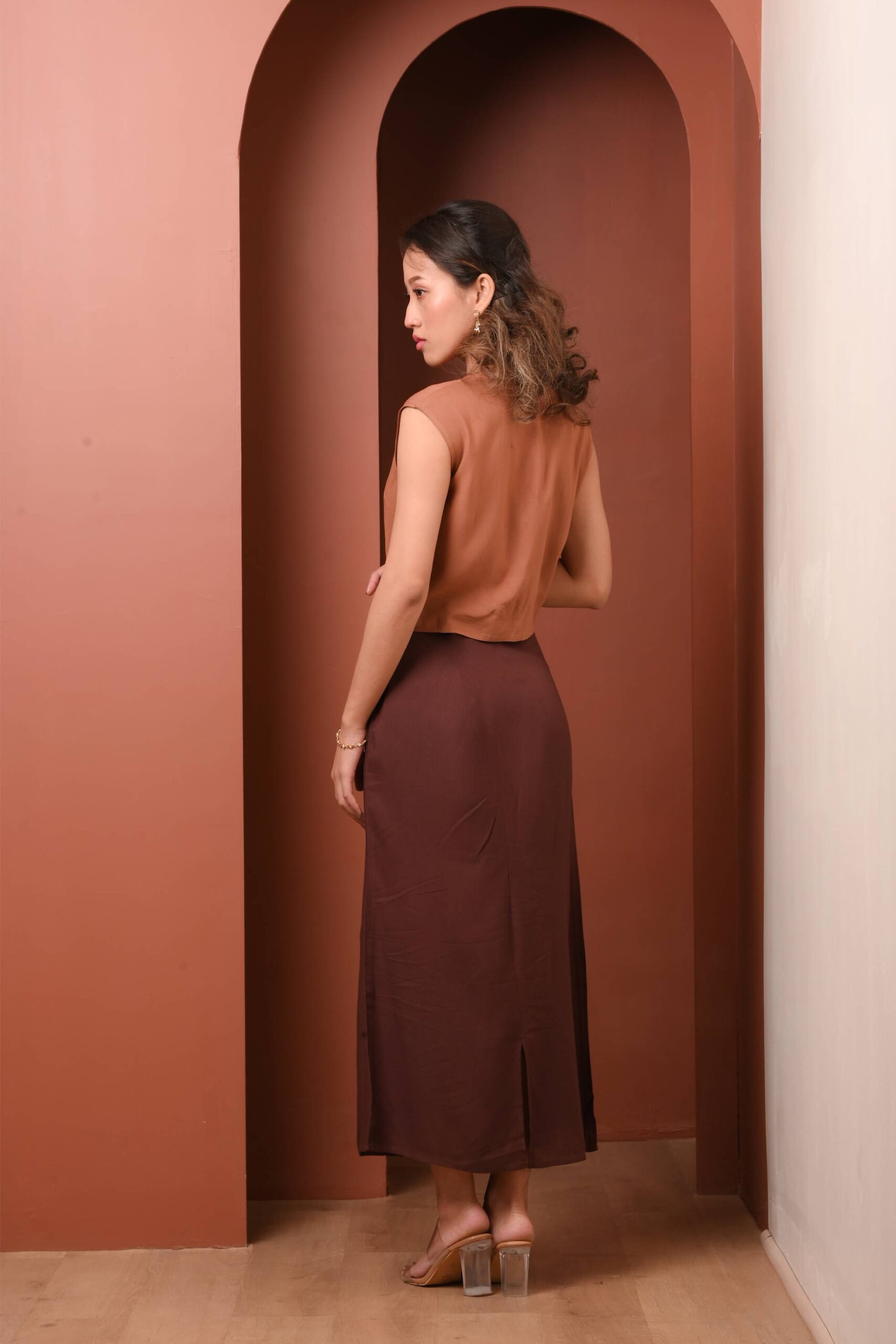 Crafted entirely in fluid viscose, the top features a V-neckline with a subtle plunge and contour seams, shaping the bodice visually while maintaining a light, effortless drape.
