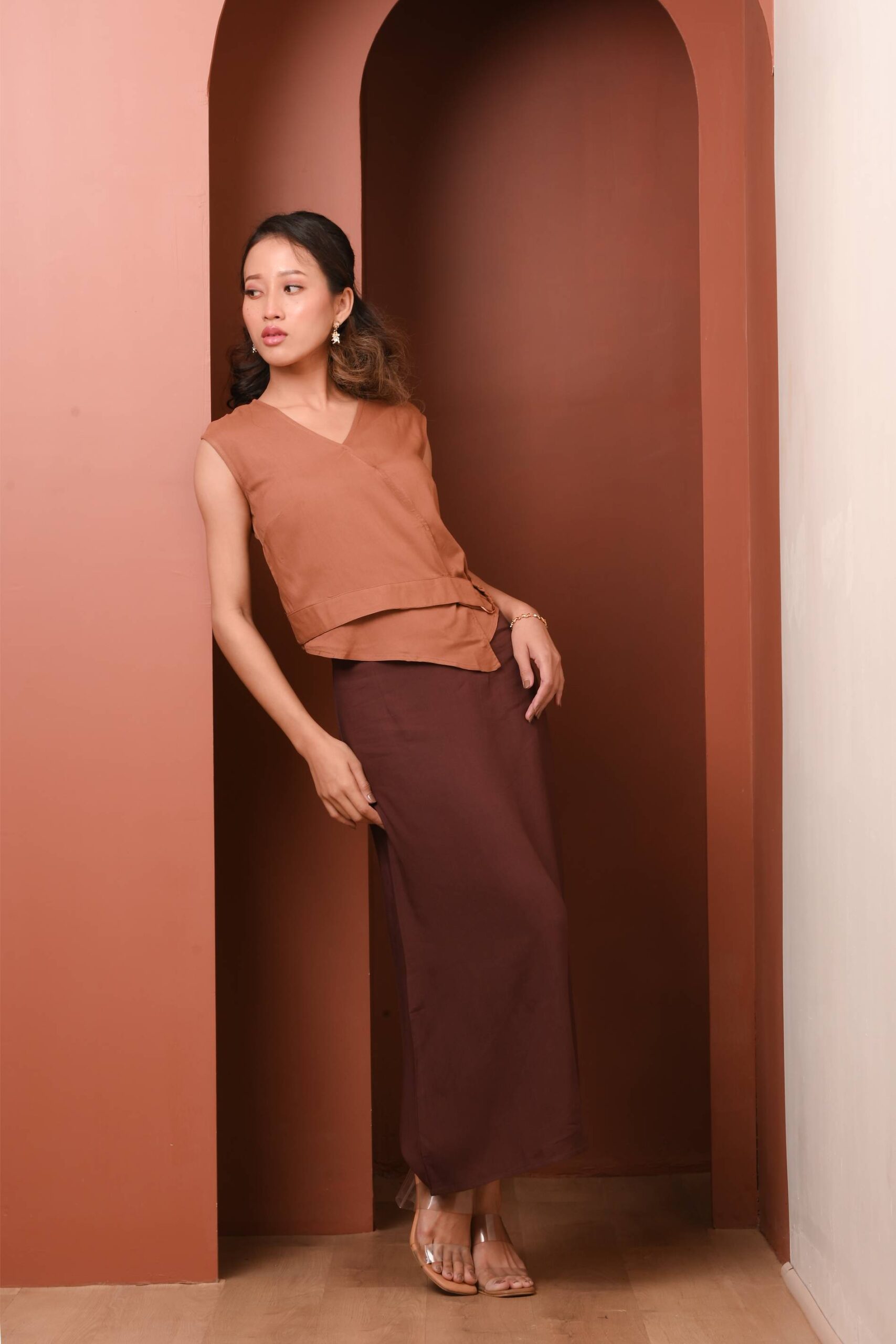 The asymmetric layered hem and gentle drape make it an easy everyday piece, pairing seamlessly with tailored trousers or casual denim.